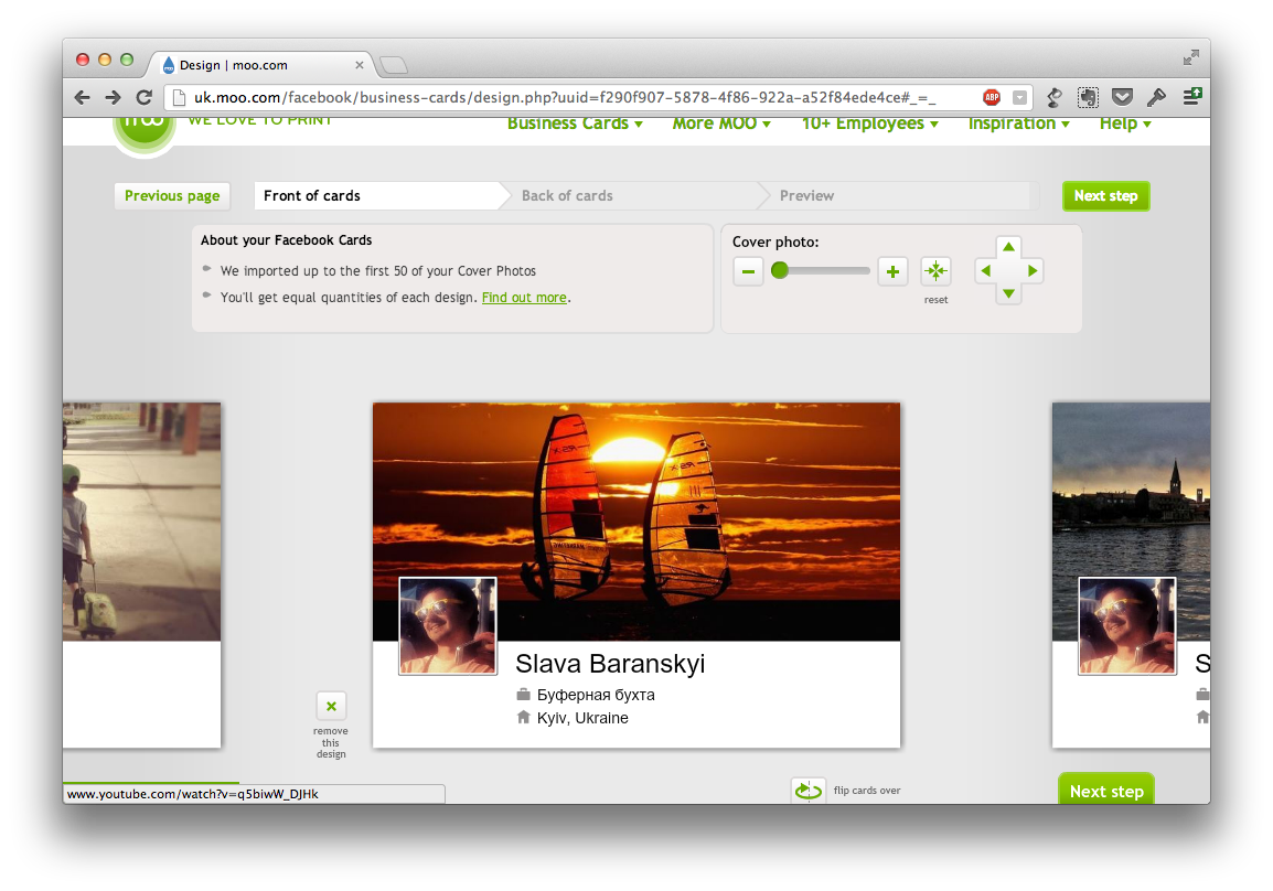 Оказывается в Facebook можно заказать 50 бесплатных визиток. Оплачивается только доставка - 3 английских фунта. Печать делает компания Moo.